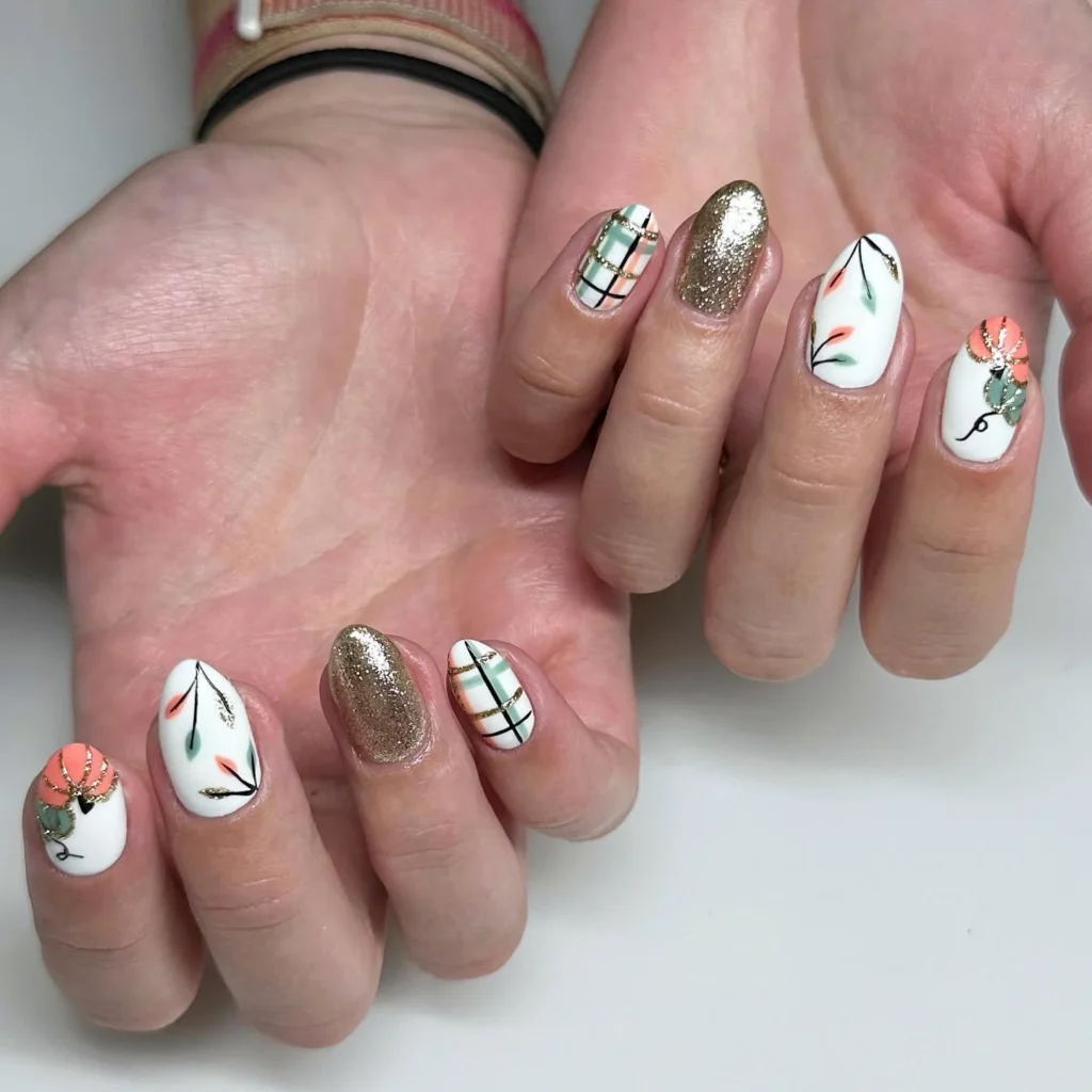 Cute, cozy, and so Thanksgiving—it’s like your nails are wearing a plaid scarf. With gold glitter accents, plaid detailing, and tiny pumpkins, this set is festive yet playful. It’s the nail art equivalent of sipping pumpkin spice lattes by the fire.