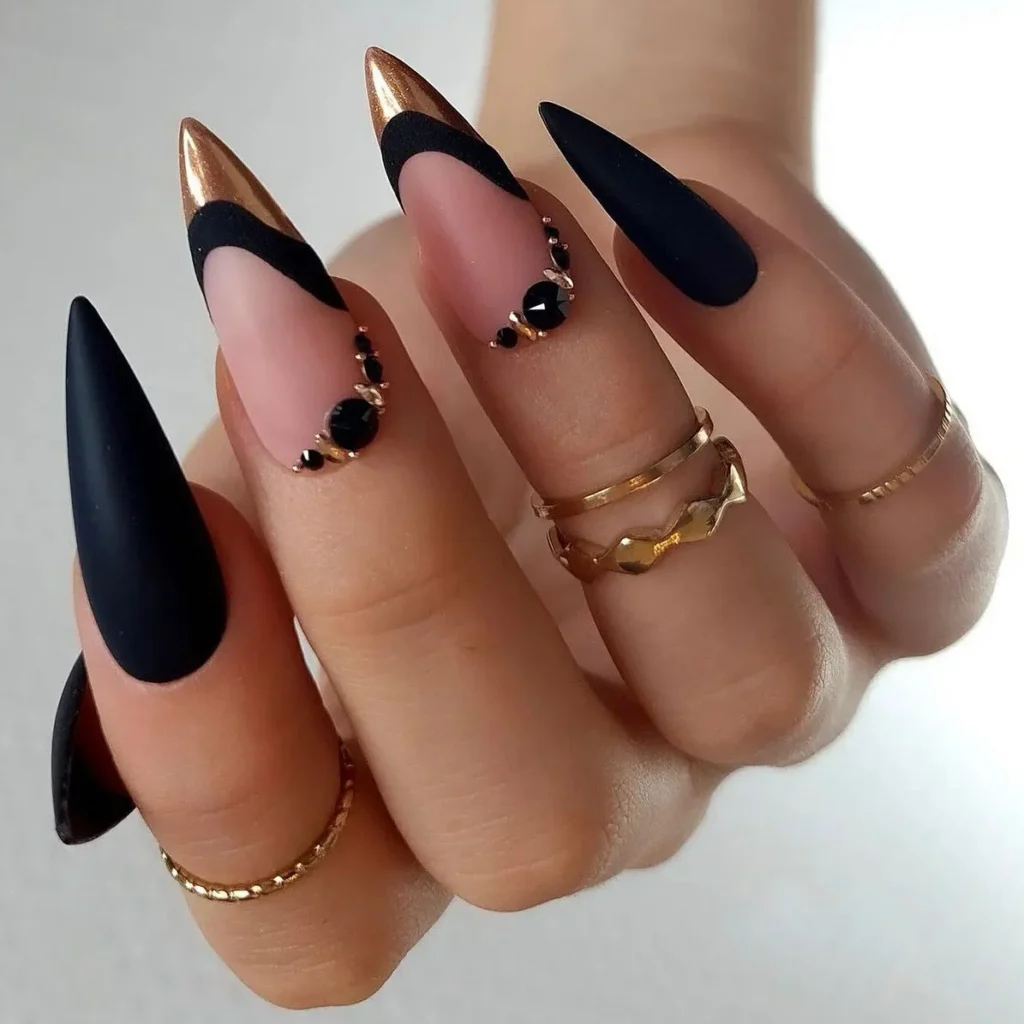 Black nails, but with a royal twist. The matte finish paired with golden edges and gems gives this design serious luxury vibes. It’s glamorous without being loud—a design fit for a queen.