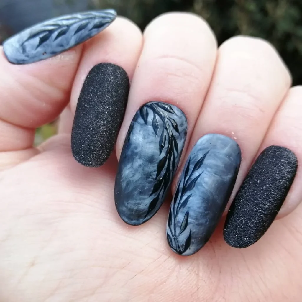 This one screams high fashion, like lace gloves captured on your nails. The mix of matte black and delicate lace-like details feels both sultry and classy.