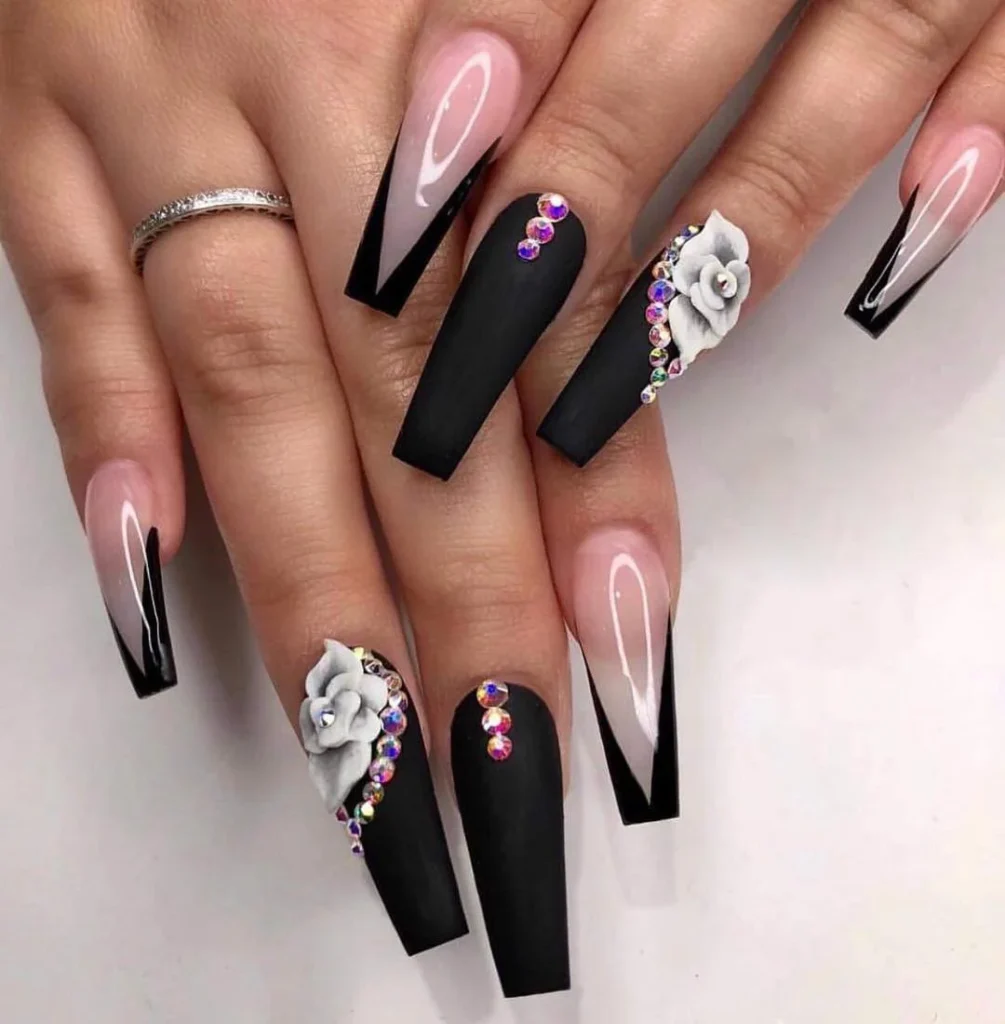 Nothing says luxury like matte black nails dressed up with rhinestones and 3D roses. This look screams red-carpet energy — bold, dramatic, and unapologetically glamorous.