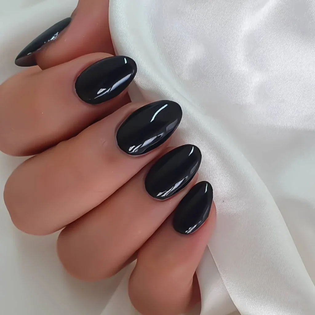 Picture yourself in a silky black evening dress — these glossy oval nails are the perfect accessory. They’re simple yet striking, proving that sometimes less really is more.
