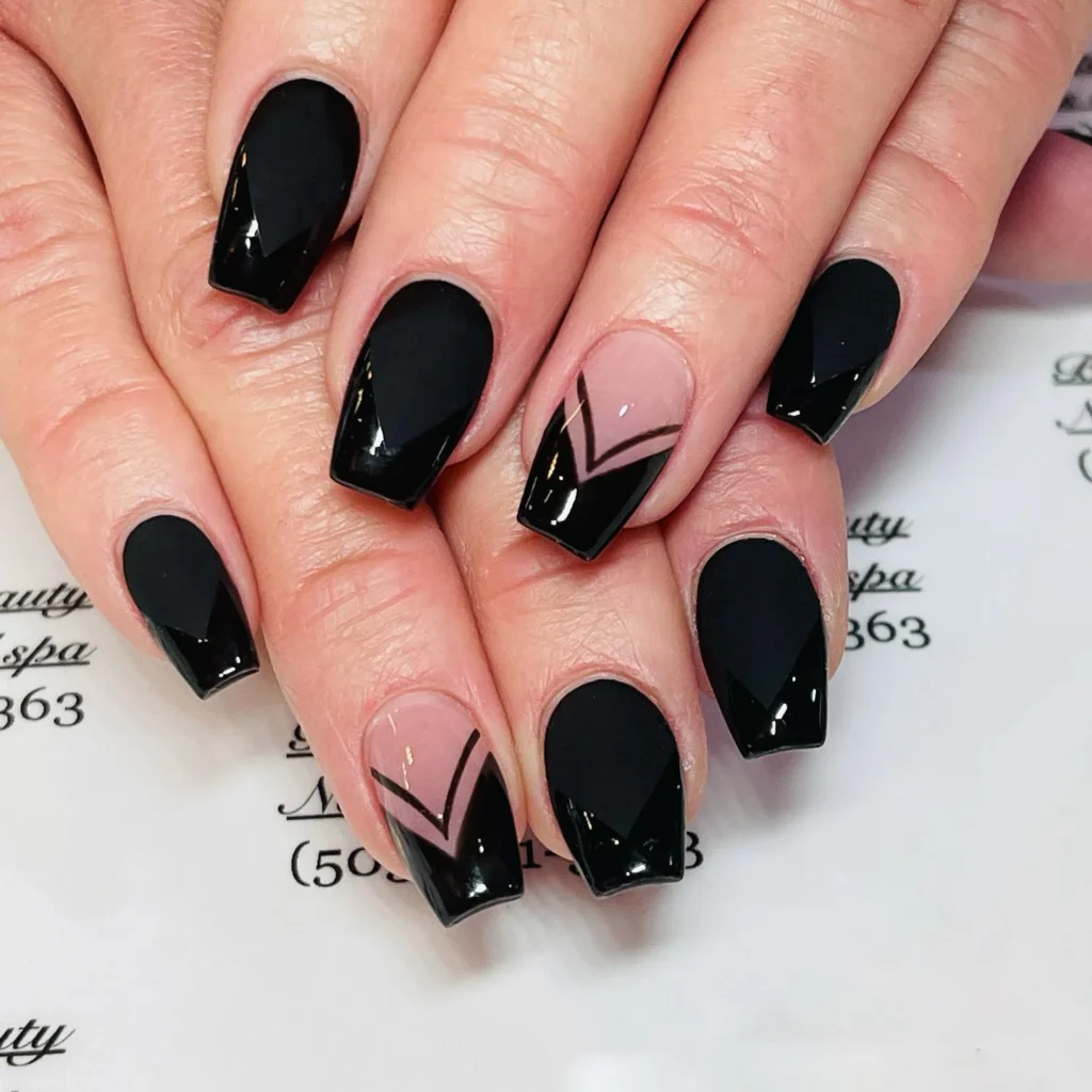 Matte black nails with shiny chevron tips? Absolute chic overload. The design is sharp, clean, and surprisingly versatile — you can wear it with streetwear or at a cocktail party.