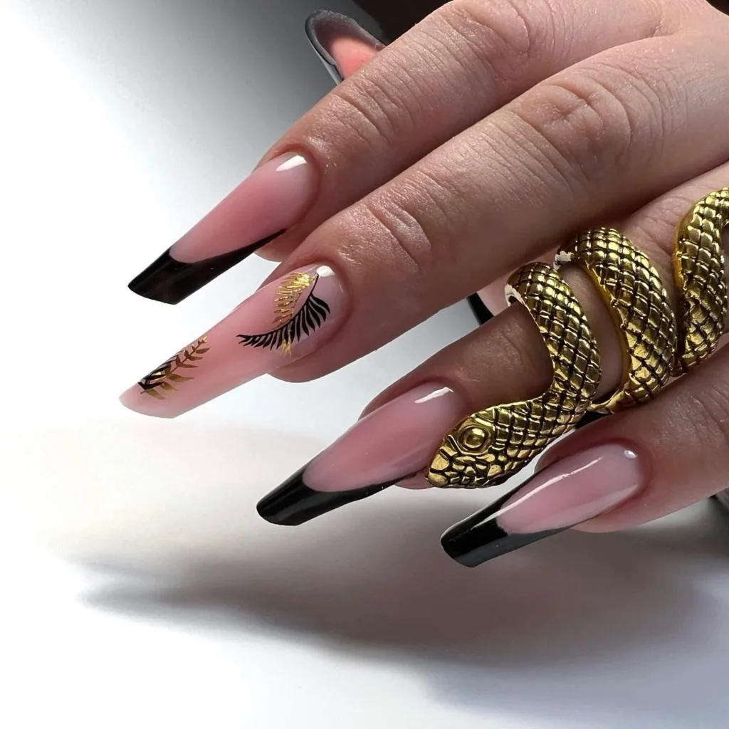 Gold meets black in the most elegant way with delicate feather decals and long French tips. It’s classy but with a bold, high-fashion punch.