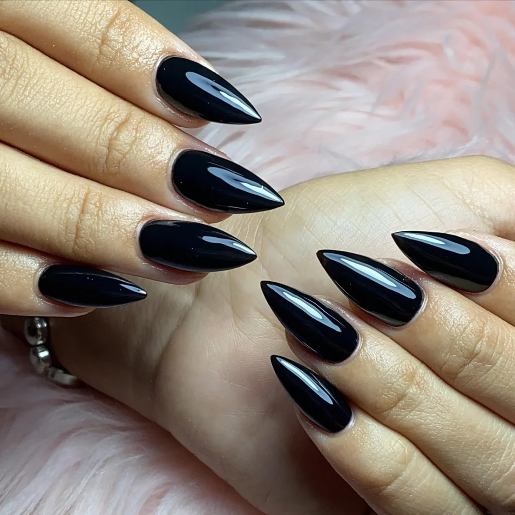 Picture yourself at a night event with a little black dress—these glossy stiletto nails would steal the show. Sleek, polished, and dangerously chic, they give “timeless but deadly” energy.