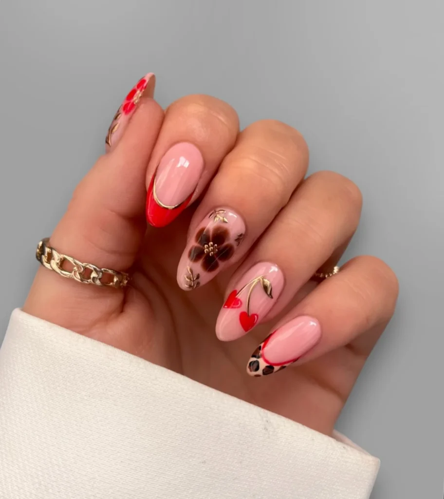 A romantic mix of red hearts, delicate florals, and subtle animal print creates a bold yet playful manicure. Golden accents bring elegance, balancing the brighter details with a sophisticated shimmer. Each nail carries its own unique story while still feeling cohesive as a set.