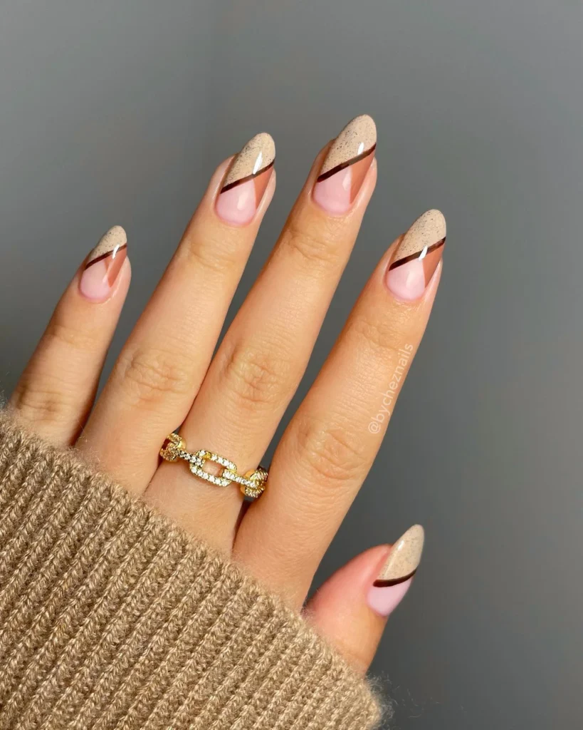 A natural nude base pairs with sandy beige tips, separated by a sharp chocolate-brown diagonal line. The clean geometric cut adds structure, giving the nails a modern architectural edge. The muted tones capture early fall’s cozy neutrals, versatile enough for sweaters or tailored coats.