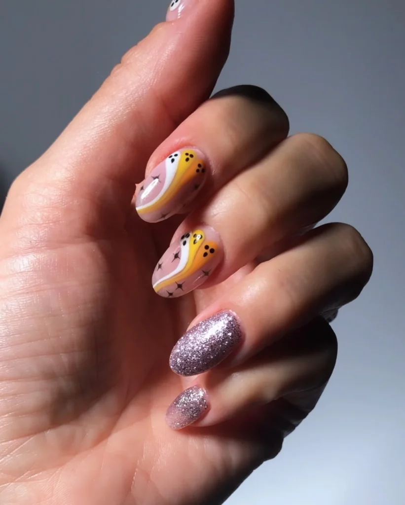 Sparkling pink glitter nails bring bold glamour, while yellow and white swirls on a nude base add playful movement. Black dotted accents break up the brightness with contrast, giving the design energy. The combination feels festive yet wearable, perfect for nights out or early seasonal gatherings.