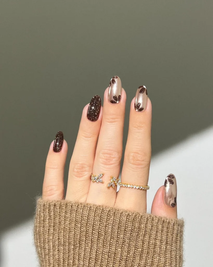 Warm chocolate glitter pairs with glossy beige for a striking, high-contrast fall manicure. Leopard-like spots add texture to the lighter nails, making the design dynamic and bold. The glitter nails sparkle dramatically under light, while the beige keeps the palette balanced.