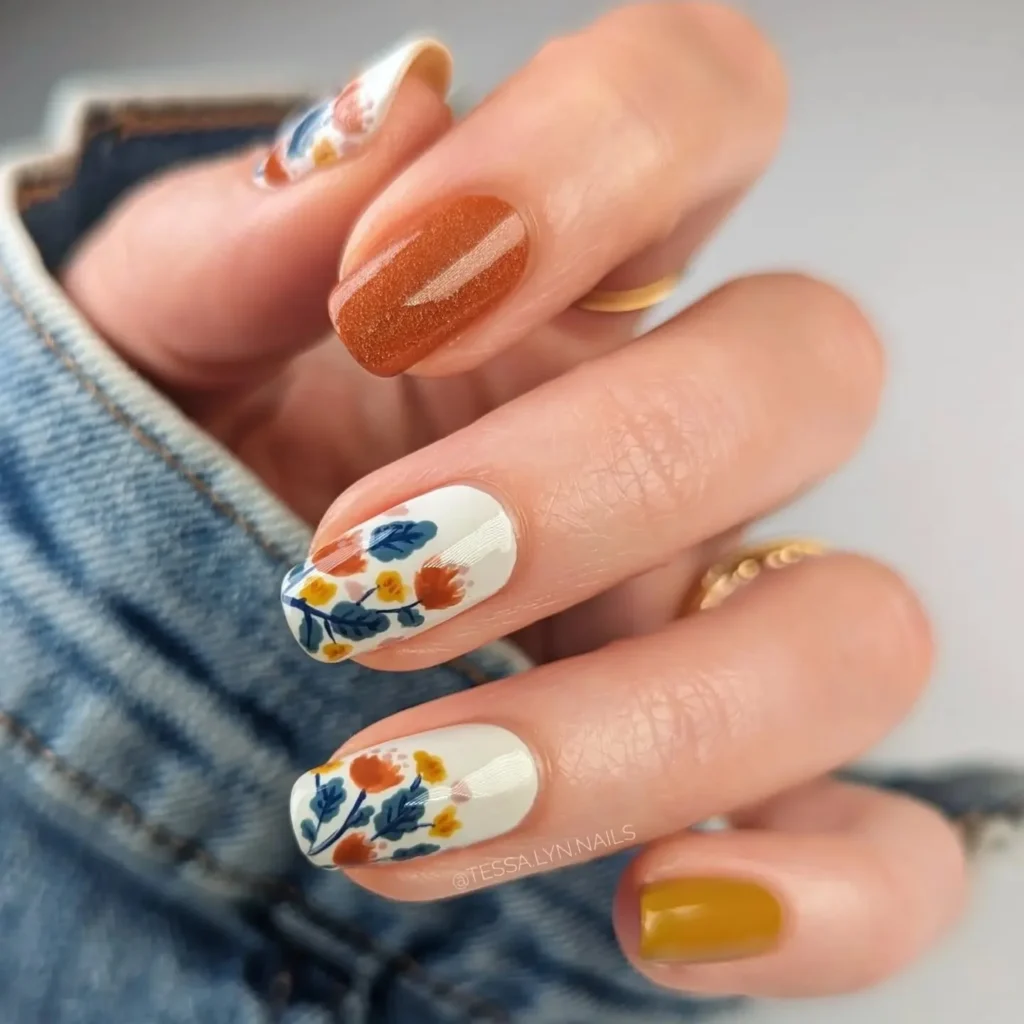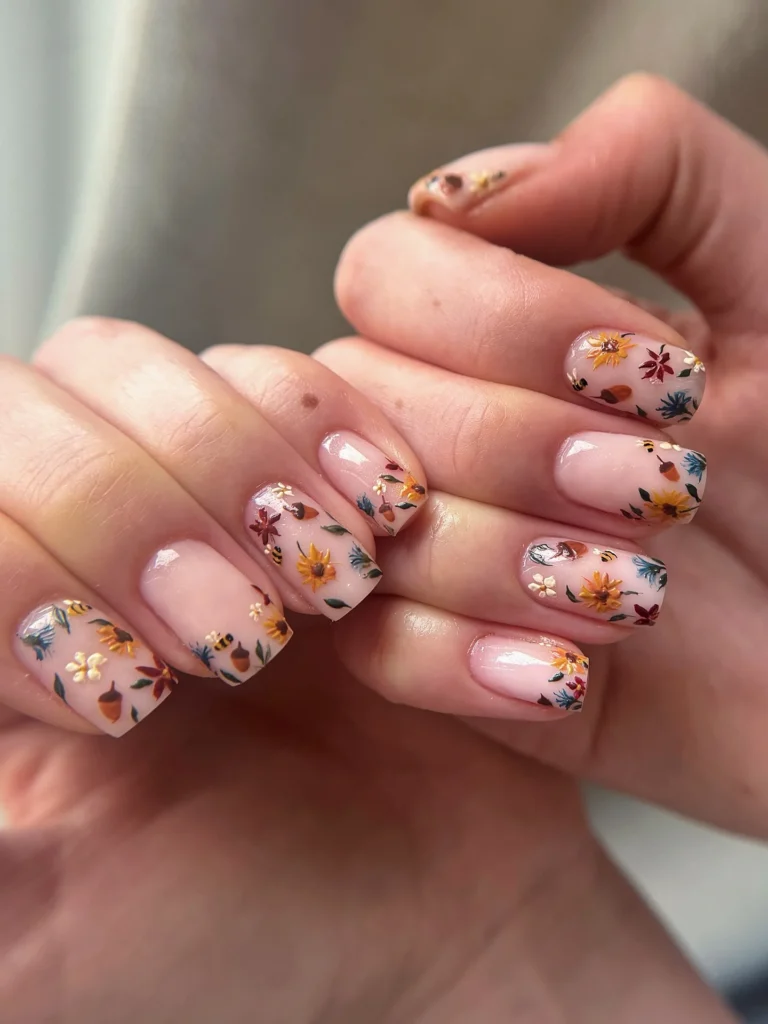 A nude base sets the stage for delicate florals in warm autumn tones of orange, red, and yellow. Tiny leaves and acorns scatter across the nails, echoing the richness of fall foliage. Each nail feels hand-painted with detail, resembling miniature pieces of seasonal art.