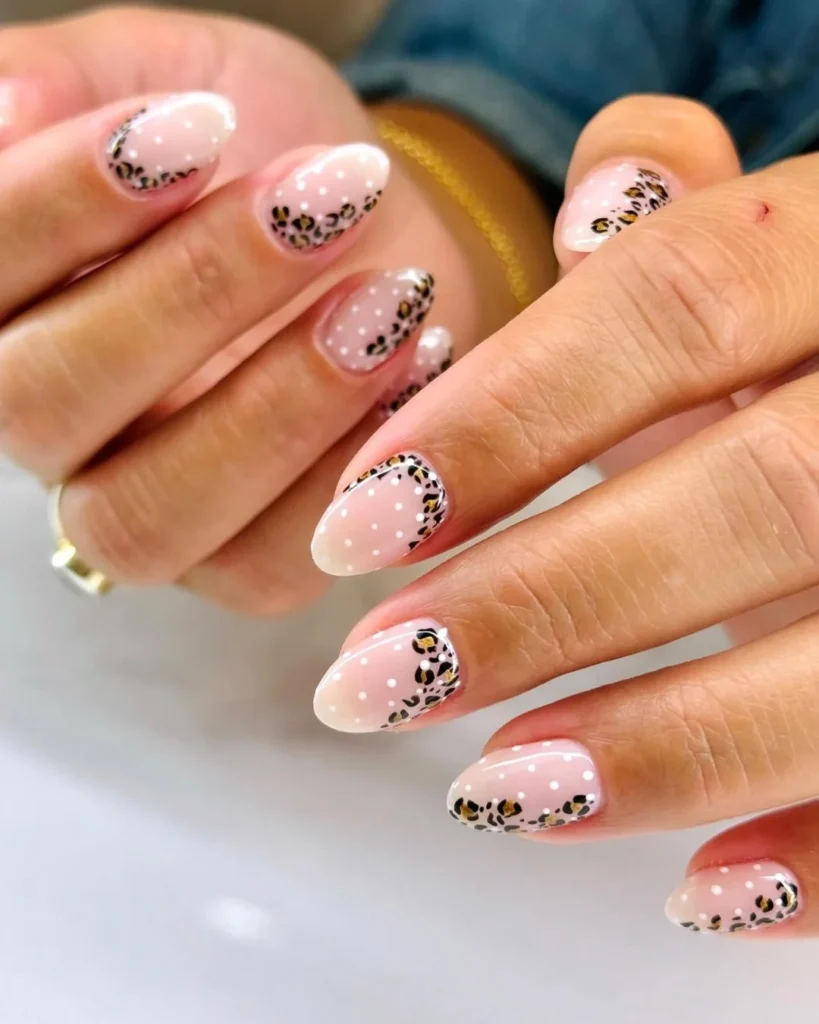 Soft pink bases are elevated with delicate polka dots and leopard print edging. The mix of animal print and classic dot pattern feels fun and modern. The semi-French placement of details keeps the design light and airy, without overwhelming the nails. Leopard print adds a trendy edge, while dots bring sweetness.