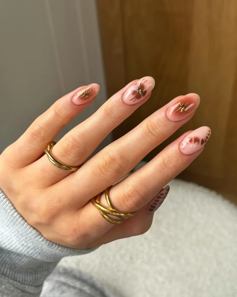 Nude nails are softened with earthy brown shading and accented by golden starbursts. The transparent base keeps the design light, while warm tones and star details add dimension. Subtle gradient shading on the sides introduces depth and movement.