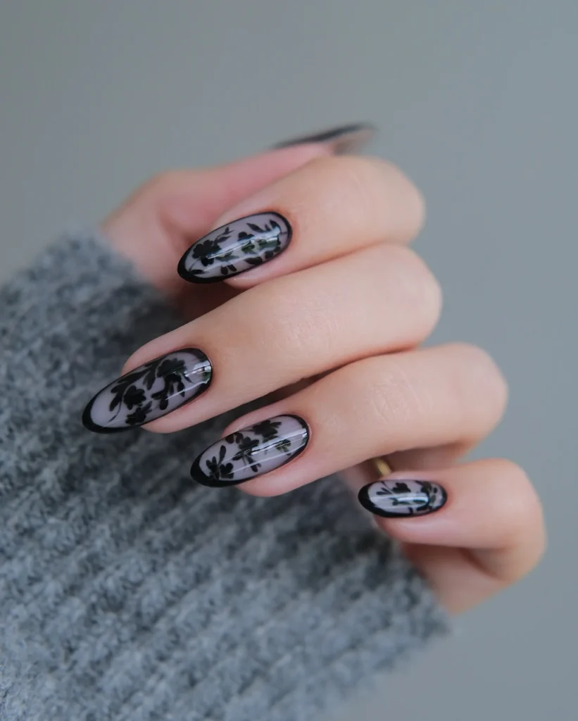 A sheer nude base becomes the canvas for bold black floral overlays, creating a dramatic and elegant manicure. The delicate flowers are framed with black borders, adding definition and making each detail pop. This design feels both romantic and edgy, blending softness with strength.