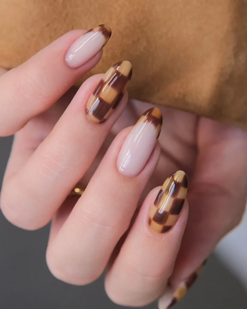Warm caramel and deep chocolate tones swirl together in a tortoise shell effect, creating a chic fall-inspired manicure. The design alternates between full tortoise detailing and French-style tips, adding visual variety. The glossy nude base balances the richness of the brown shades, keeping the look sophisticated and polished.