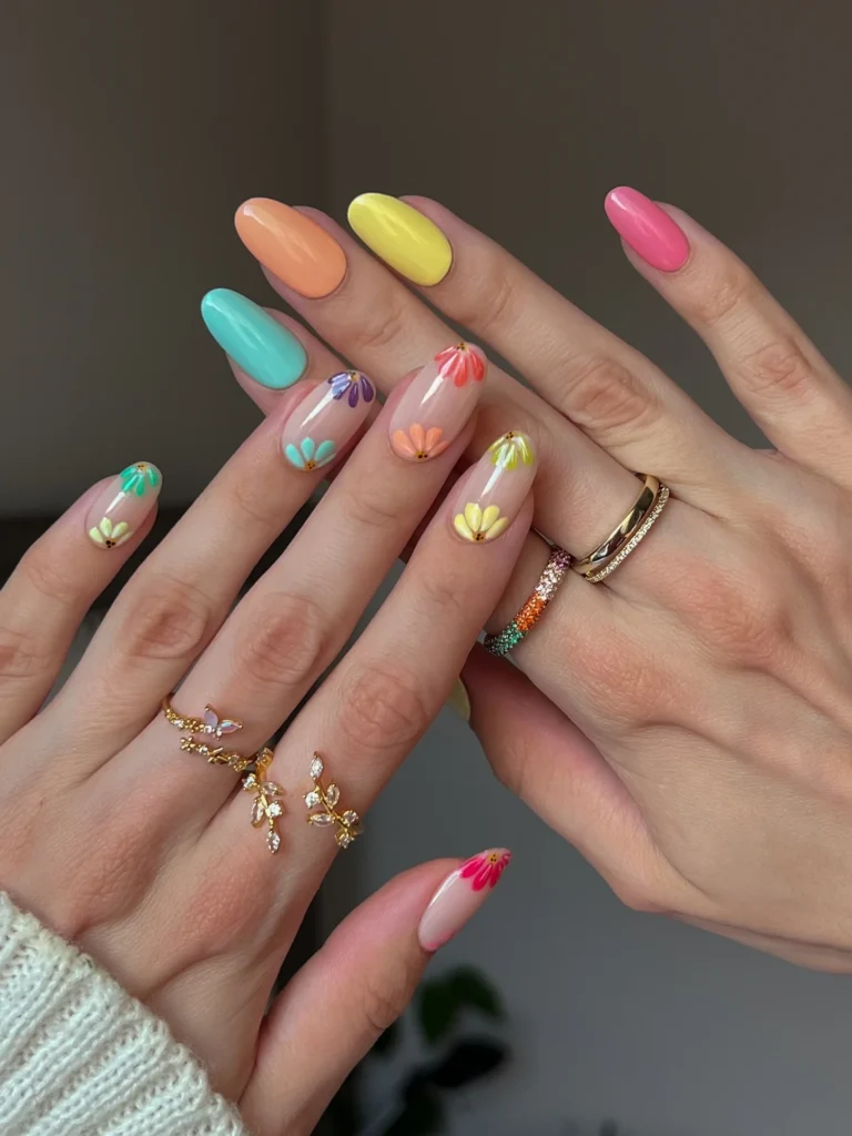 Each nail bursts with color, featuring cheerful daisy designs in a rainbow palette against a natural base. Bold pops of yellow, pink, blue, and orange bring joy while maintaining a clean, balanced finish. The daisy placement makes each nail stand out as a mini piece of art.