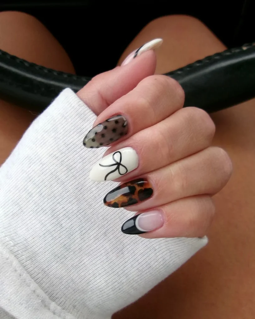 Black, cream, and brown tones merge into a chic fall-ready set with unique accents on each finger. A simple bow, bold leopard print, and layered polka dots add playful variety without losing harmony. The nude-to-black French detail introduces balance while tying everything together.