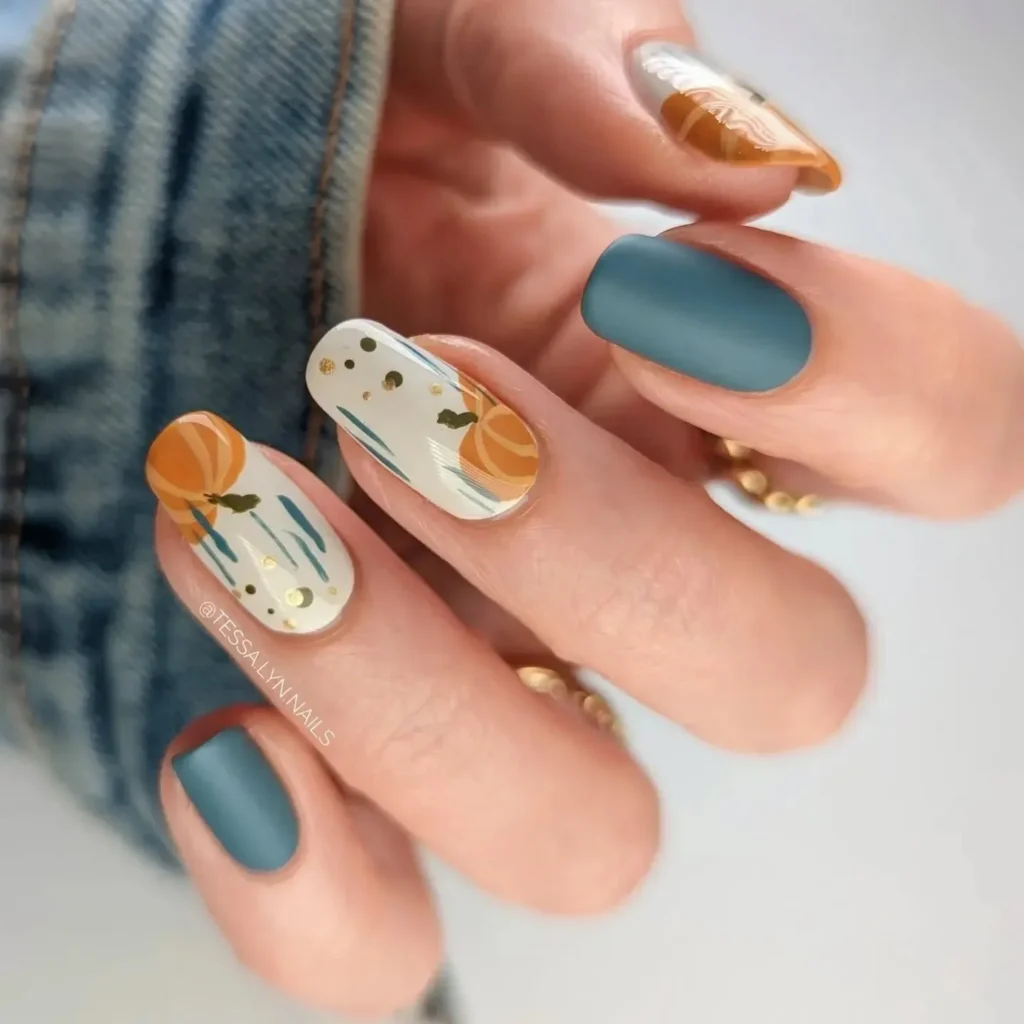 Cool sky blue bases transform into abstract tree designs with bold strokes of orange, red, and mustard. Paired with solid orange and yellow nails, the set brings fall landscapes to life. The contrast between the vivid tree art and solid shades feels balanced yet bold.