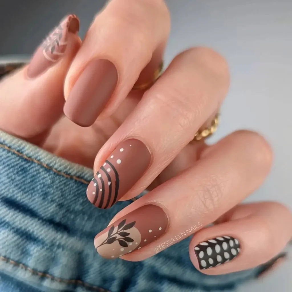 Matte chocolate tones set the mood for fall, accented by minimal leaf art and polka dot contrasts. The earthy brown base feels grounded, while the monochrome leaf adds a hand-painted charm. Crisp lines and dotted details create a balance of structure and softness.