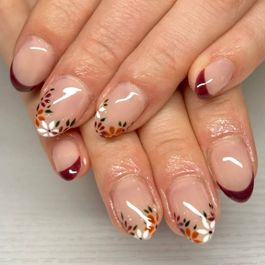 Delicate and eye-catching, these nails create the perfect blend of modern minimalism and seasonal charm. Burgundy French tips add a bold edge against a soft nude base, instantly elevating the classic design. Tiny floral accents in warm orange, white, and green mimic autumn leaves scattered in nature.