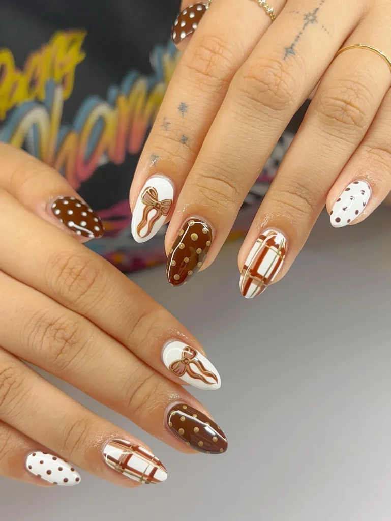 cheerful and cozy, this nail set combines timeless plaid, delicate bows, and fun polka dots. The brown and white palette feels warm and inviting, while the mix of patterns ensures each nail tells its own story. Tiny golden details bring a touch of refinement, adding just enough sparkle without overwhelming the design.