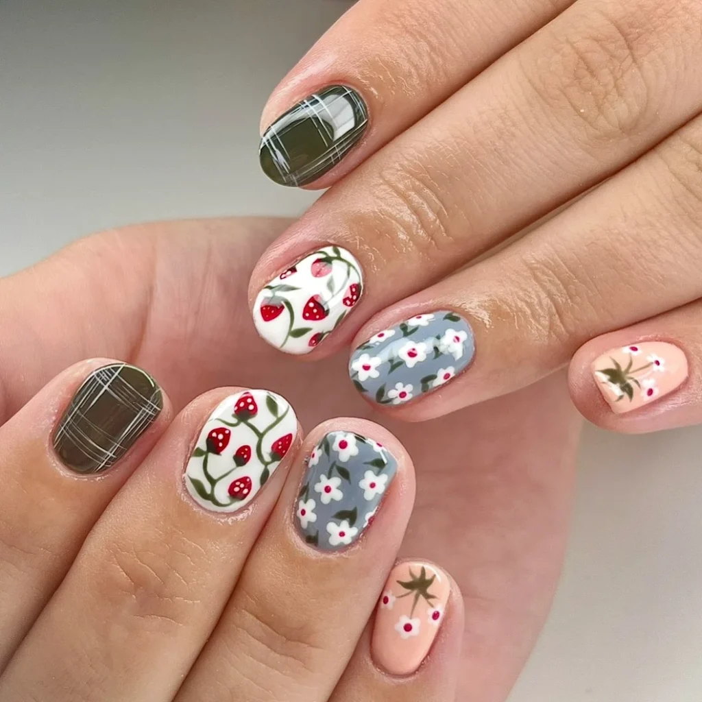 Fresh and whimsical, this manicure combines cheerful strawberry art with dainty floral prints. Deep olive-green plaid adds contrast and makes the fruity elements stand out even more. A soft peachy nude is used as a base on some nails, tying the whole palette together with warmth.