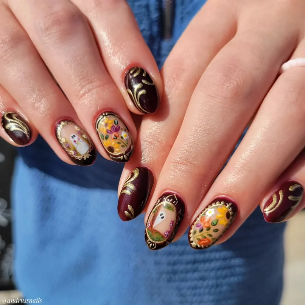 Luxurious yet fun, these nails pair a rich burgundy base with hand-painted gold scrolls. Framed accent nails feature intricate autumn florals and a playful ghost design, bringing a seasonal twist. The golden accents elevate the art, making the details pop like miniature paintings.