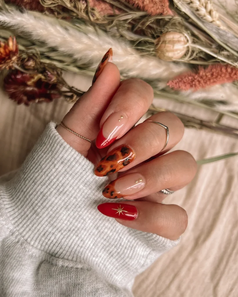 Earthy tortoiseshell patterns blend beautifully with bold red accents in this striking manicure. A single nude nail with a crisp red French tip creates balance and contrast. One red nail carries a delicate golden star, adding a subtle but eye-catching detail.