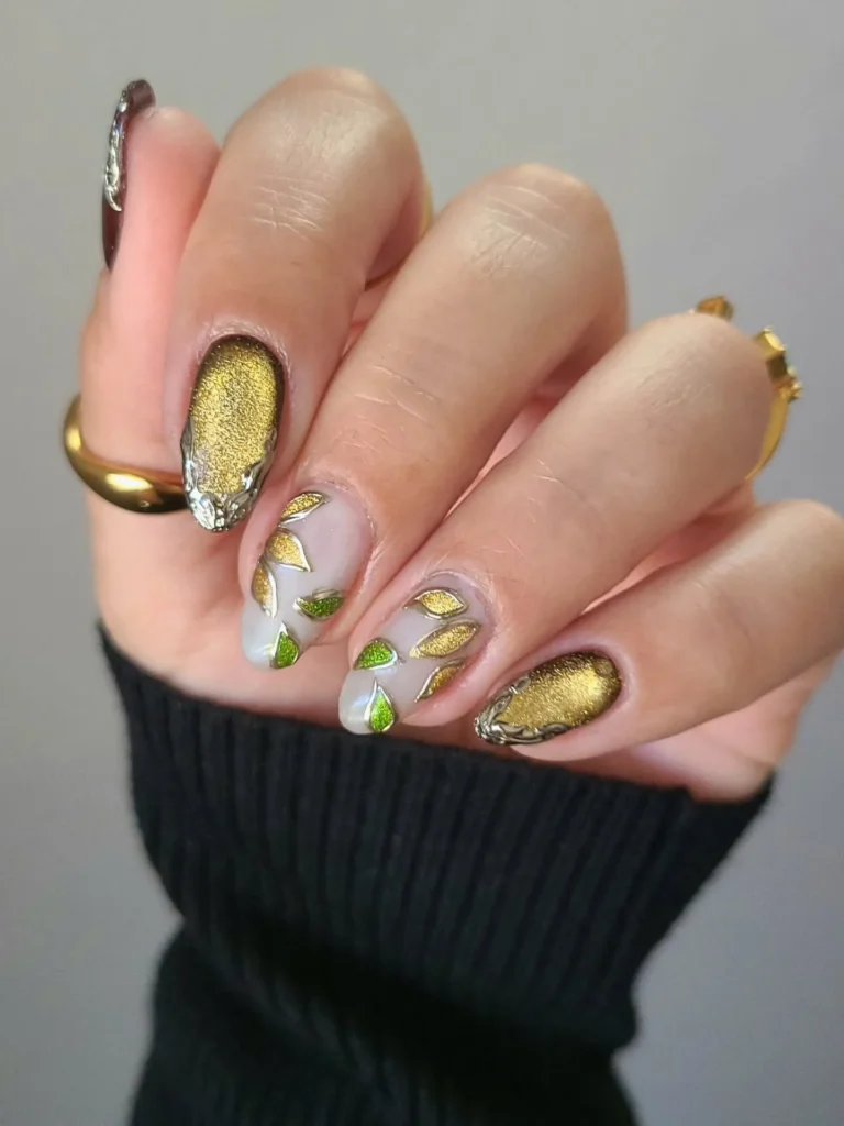Rich golden shimmer dominates this nail set, instantly catching the light with each movement. Some nails feature delicately placed metallic green and gold leaf motifs over a translucent base. The effect is bold yet balanced, blending opulence with natural inspiration.
