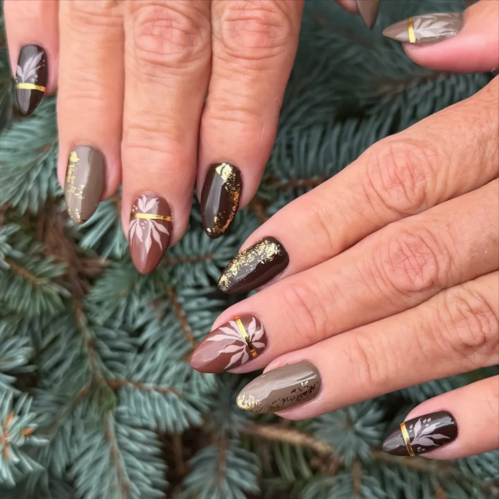 #15. Brown Nails with Gold Foil and Leaf Patterns
