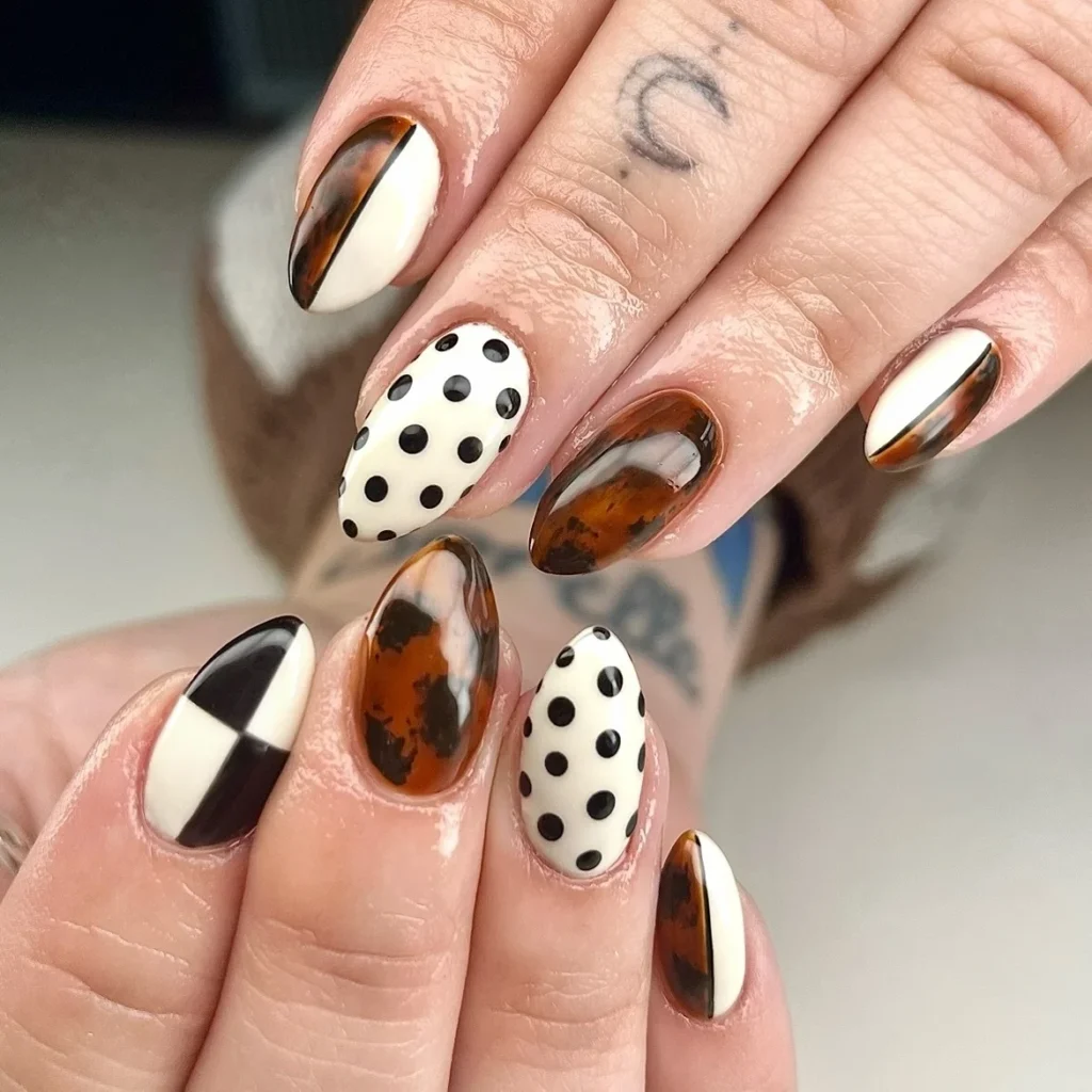 Cheerful and bold, this manicure combines classic tortoiseshell patterns with graphic polka dots. Crisp black and white geometric blocks enhance the visual interest, giving the set a trendy, fashion-forward vibe. The mix of warm brown and glossy ivory keeps the palette balanced while still making a statement.