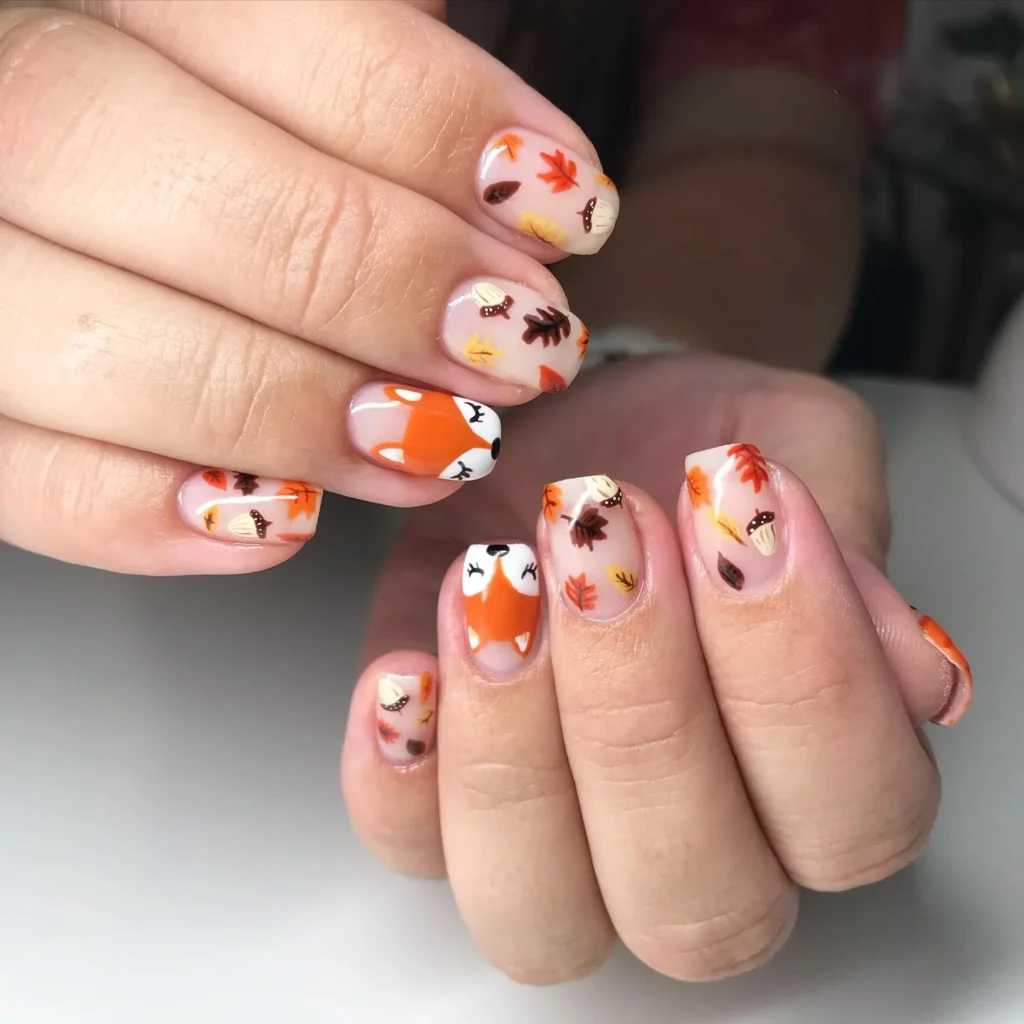 Adorable and seasonal, this manicure brings fall to life with tiny fox faces and scattered leaf motifs. Acorns and multicolored leaves decorate nude bases, giving the set a joyful yet polished aesthetic. The fox art adds a whimsical focal point while the leaves tie the theme together.