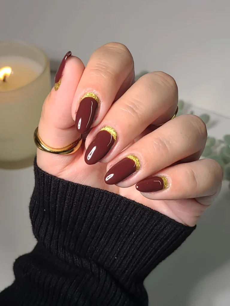 #2. Chocolate Brown Nails with Golden Cuticle Highlights