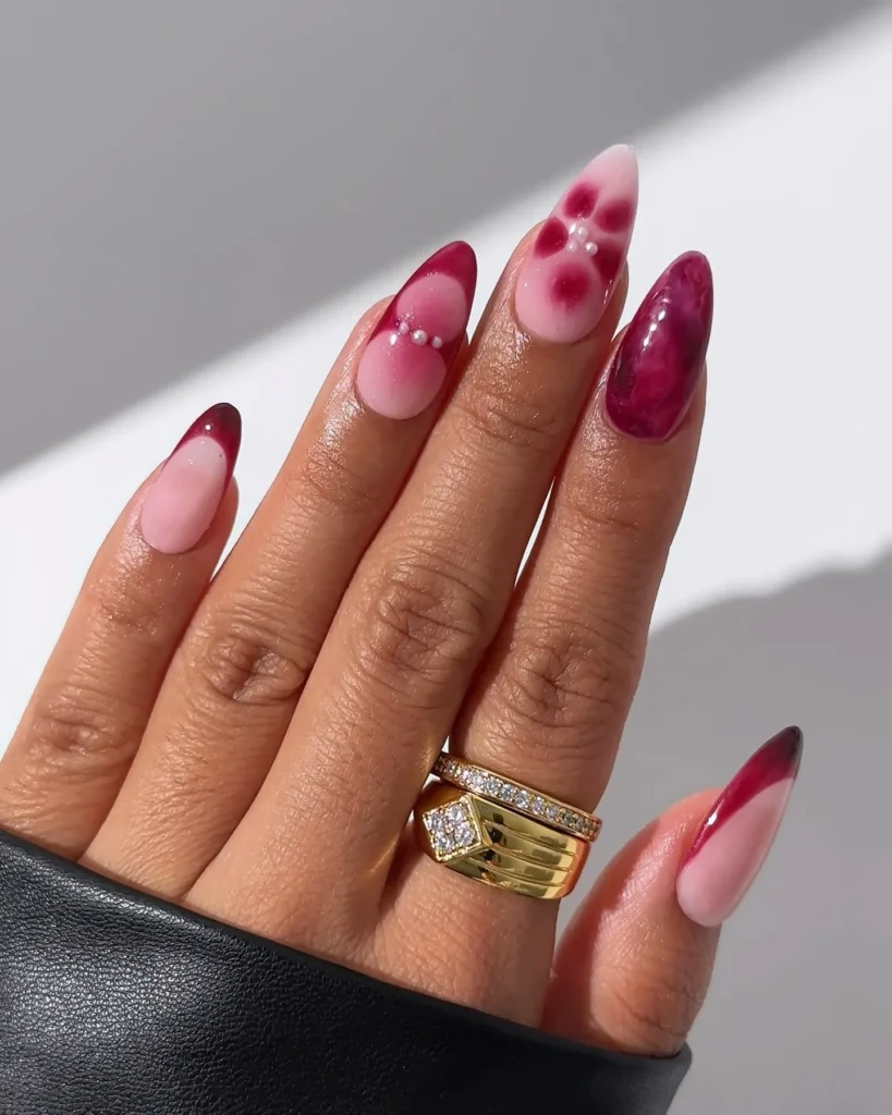 Romantic and bold, these nails fade from soft pink bases into deep burgundy tips with perfect ombre transitions. Accent nails showcase floral-inspired patterns in dreamy berry shades, finished with tiny pearl embellishments. The mix of gradient, florals, and pearls makes this design feel elegant and feminine.