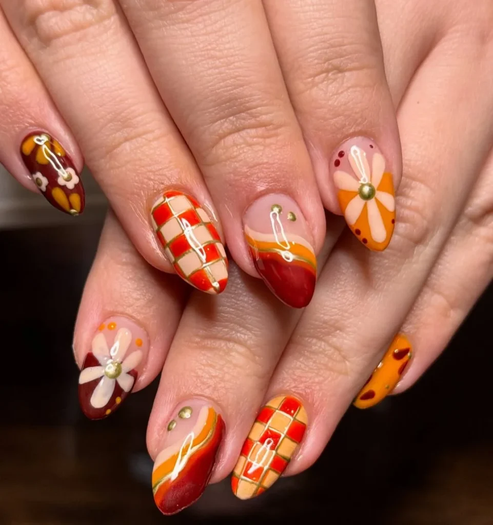 Bold and playful, this set mixes retro-inspired plaid with large floral accents for a statement fall manicure. Shades of burnt orange, deep red, and mustard yellow dominate the palette, instantly evoking cozy seasonal vibes. The mix of stripes, checkerboard, and oversized flowers adds variety while keeping a cohesive autumn theme.