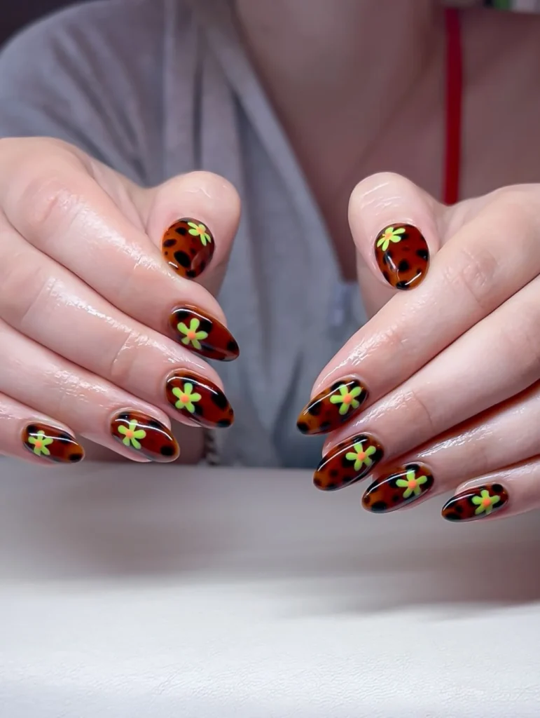 Edgy yet fun, these nails feature a glossy tortoiseshell base enhanced with neon green flowers. The warm amber-brown background creates depth, while the bold lime petals provide a striking contrast. The design feels retro yet modern, combining earthy patterns with bright pops of color.