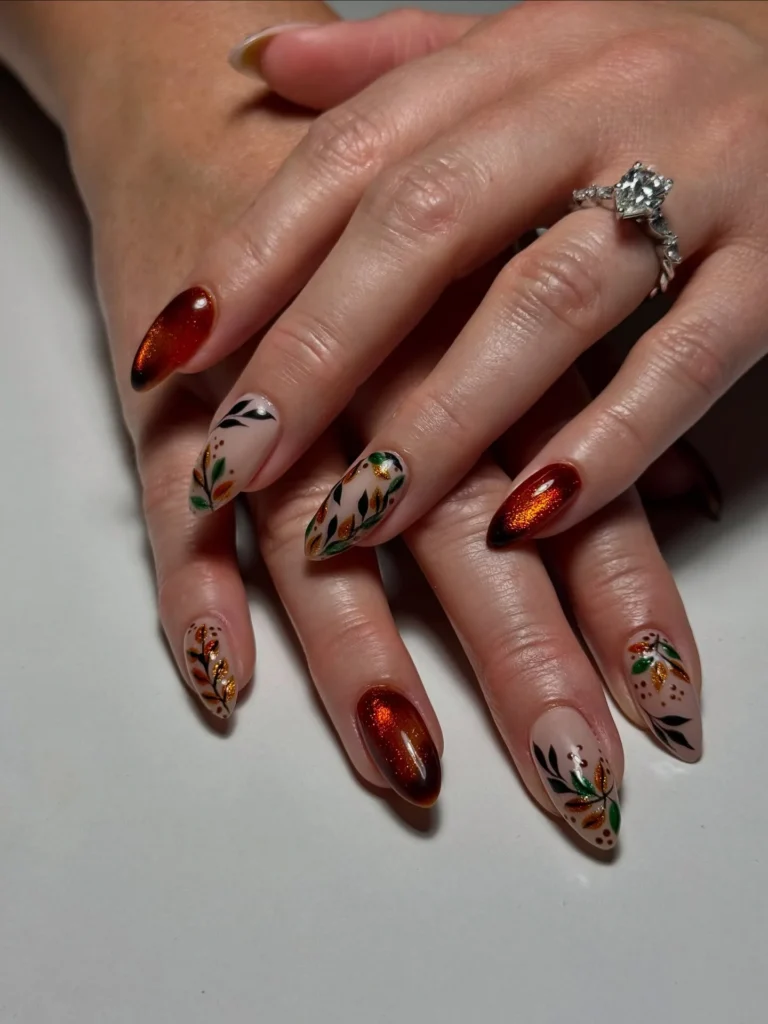 Edgy and earthy come together in this copper-inspired manicure. The metallic shimmer of the chrome nails draws attention instantly, while the nude bases with leafy designs keep the look grounded. Painted details in black, orange, and green evoke autumn leaves in mid-fall, making it feel seasonally inspired without losing sophistication.