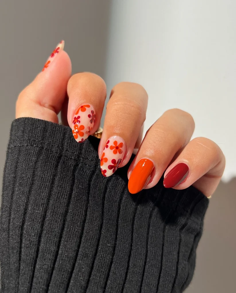 Vibrant and joyful, this design celebrates fall with lively pops of color. Nude nails decorated with red and orange florals give off a retro vibe, almost reminiscent of 70s flower power. Solid accents in bright orange and deep red complete the look, balancing the nail set with bold simplicity.