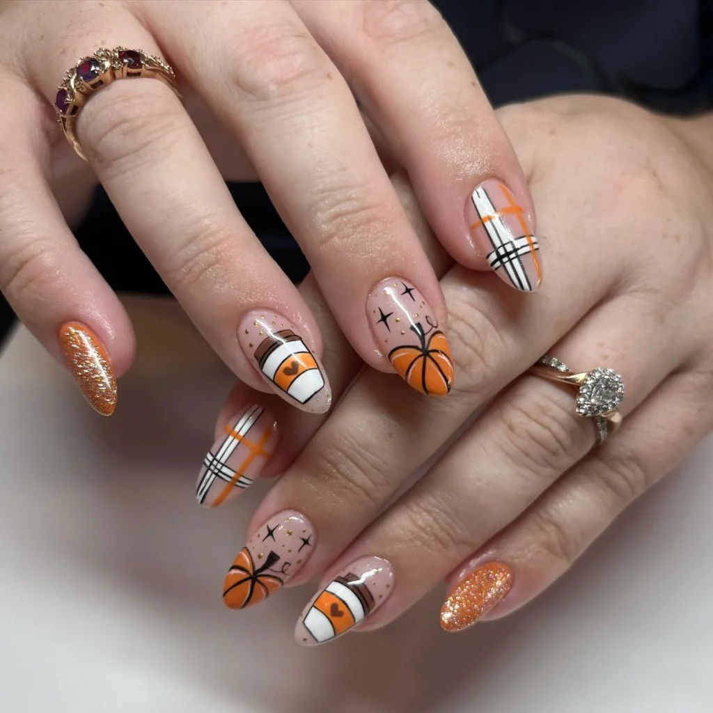 Festive and cozy, these nails bring fall to life through playful art and sparkle. Tiny pumpkins, warm coffee cups, and plaid accents sit neatly on a nude base, capturing the essence of crisp autumn days. A glittery orange nail adds extra brightness, tying the whole look together with seasonal sparkle.