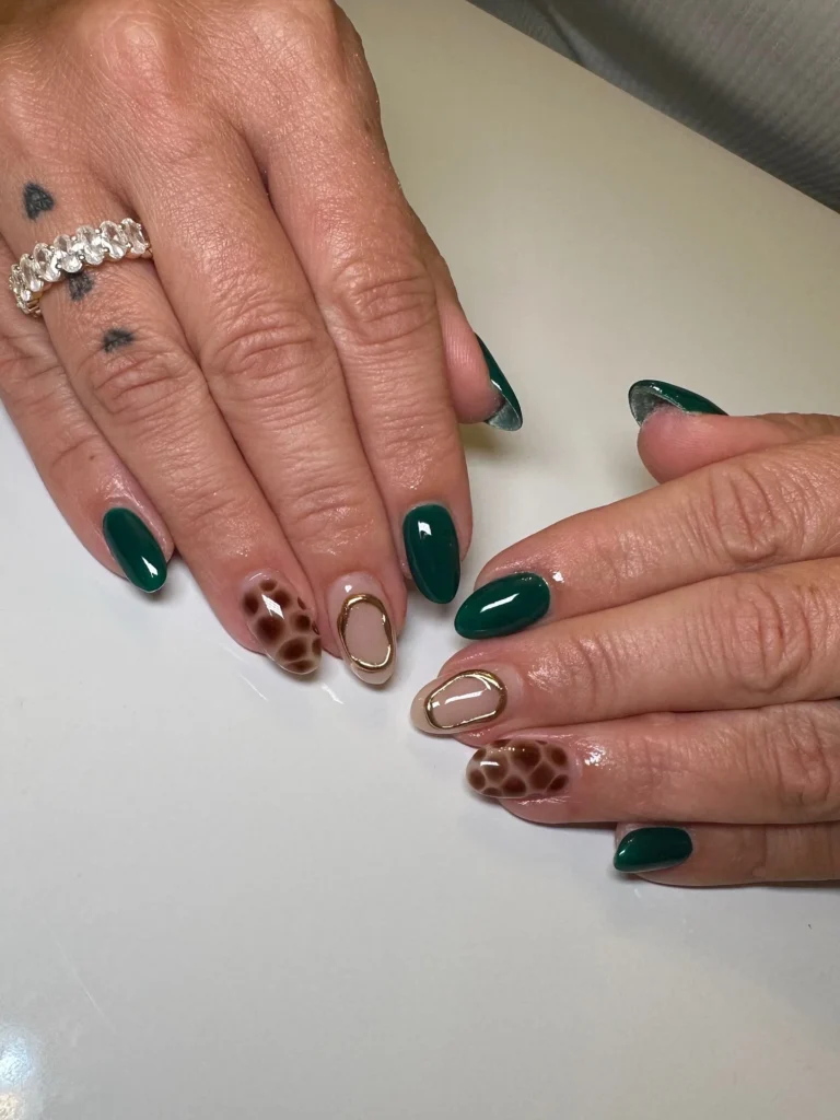 Bold yet sophisticated, this manicure mixes deep emerald green polish with animal-inspired accents. Nude nails with giraffe print patterns introduce an adventurous edge, while thin golden metallic outlines frame others for a polished finish. The combination feels rich, chic, and perfect for standing out.