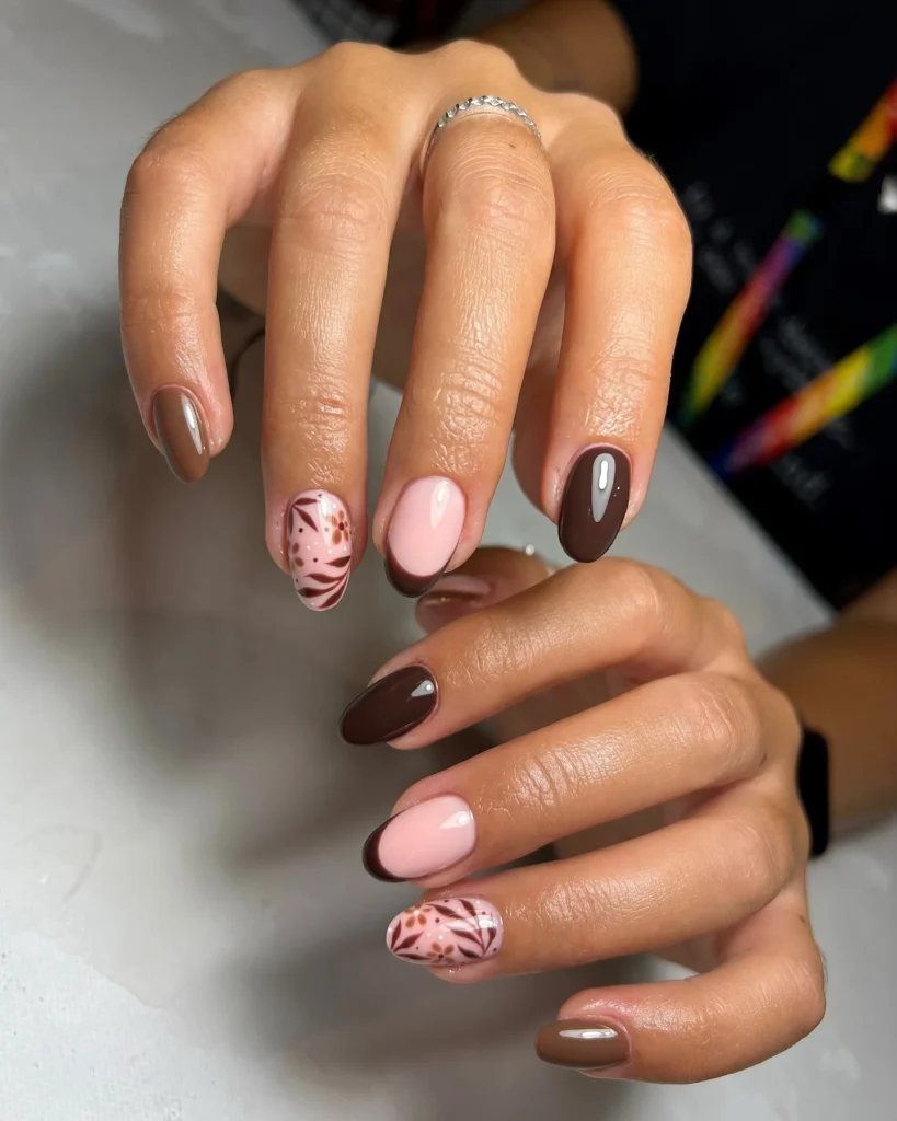 Soft blush pink and deep chocolate tones come together in this cozy manicure. Accent nails feature delicate leafy patterns, blending earthy shades with subtle artistry. The interplay of solid colors and hand-painted details feels intentional, offering both variety and cohesion.