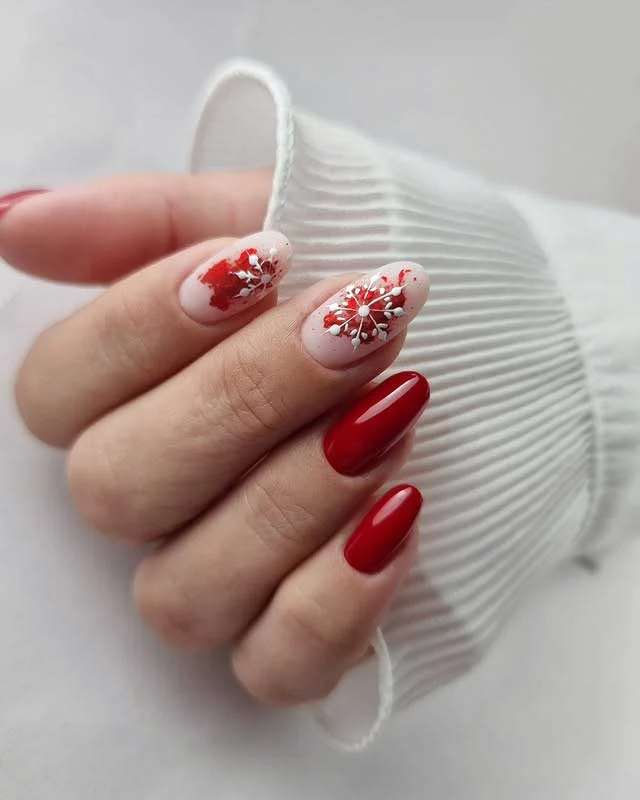 Bold red nails paired with soft nude tones create a striking contrast that feels festive and chic. Two accent nails feature delicate white floral patterns layered over rich red brush strokes, giving the look an artistic and romantic touch. The design feels both modern and timeless, making it perfect for winter holidays or Valentine’s season.