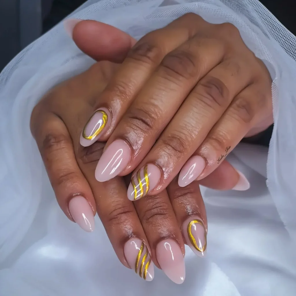 #10. Nude Oval Nails with Golden Stripes