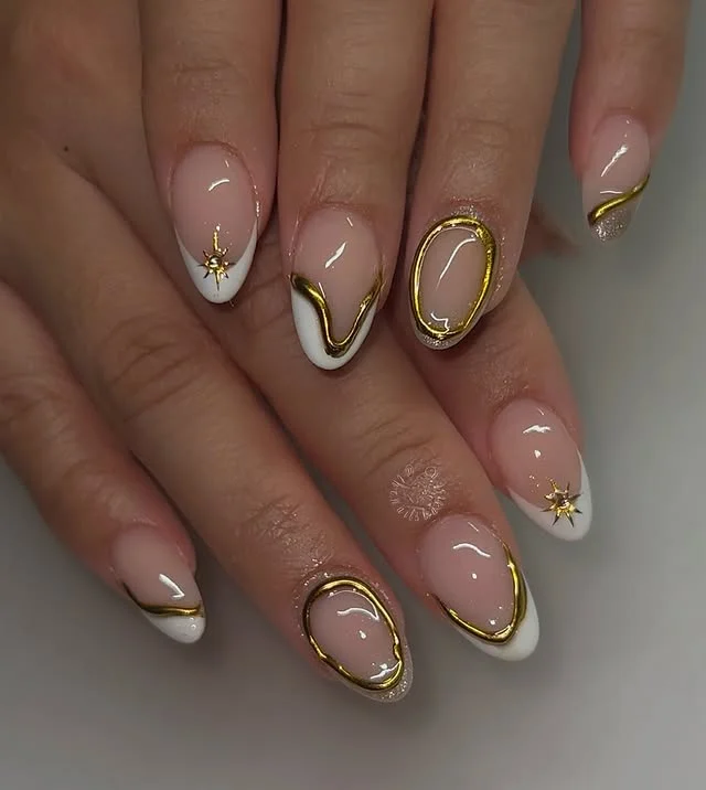 A nude base sets the stage for bold white tips enhanced with metallic gold accents. The design features a mix of flowing golden outlines, delicate stars, and curved patterns that add depth and drama. Each nail is styled differently, creating a harmonious yet dynamic look.