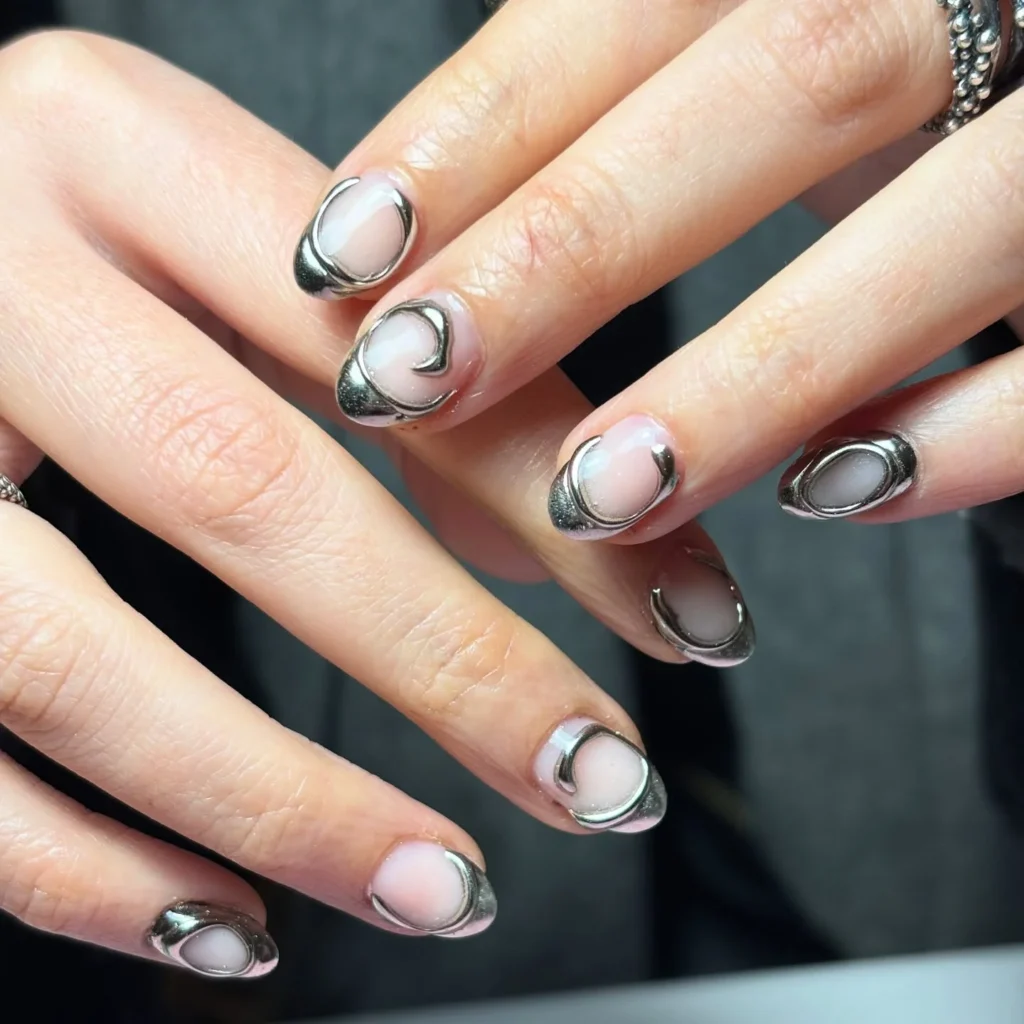 A minimalist nude base comes alive with striking silver chrome outlines. Each nail showcases a different swirl or oval pattern, making the design look futuristic and bold. The metallic accents shine under the light, giving an almost sculptural effect.