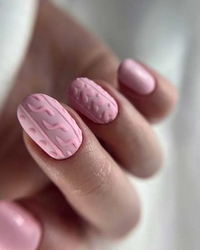 Soft pastel pink nails are given a cozy update with raised knit-inspired textures. The embossed patterns resemble sweater stitches, adding dimension and warmth to the manicure. This design combines comfort and style, perfect for winter or colder seasons.