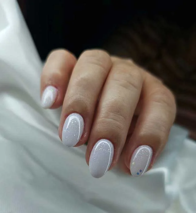 #14. White Shimmer Oval Nails with Minimalist Art