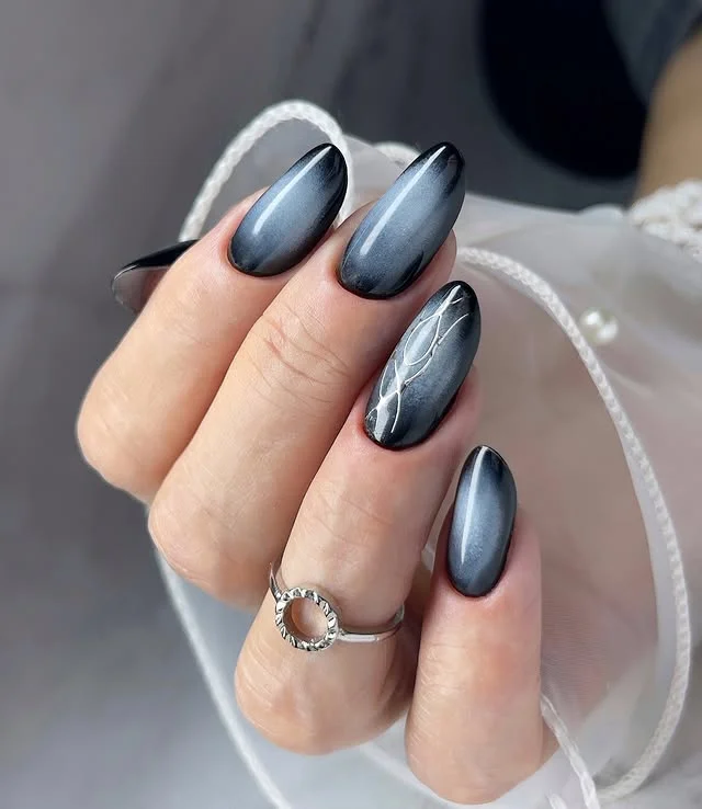 #15. Black Chrome Oval Nails with Marble Accent