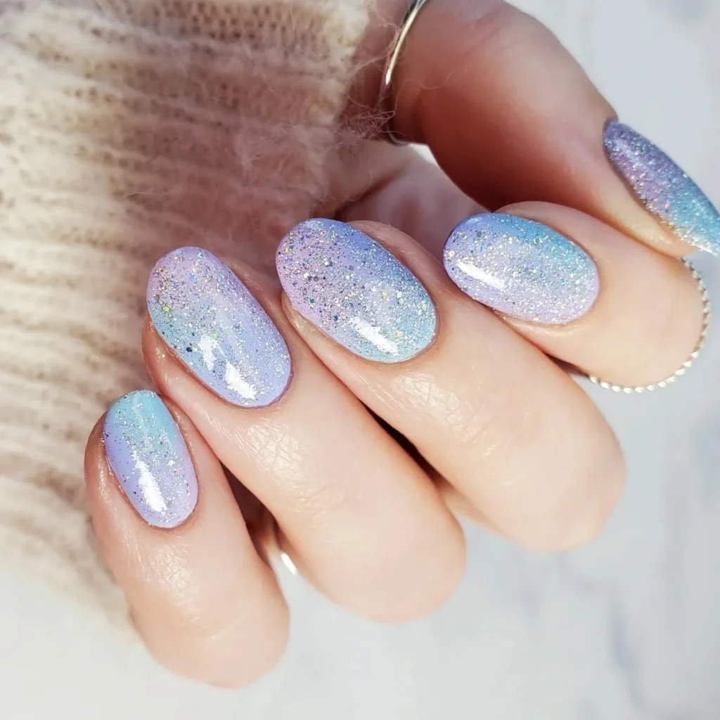 A dreamy blend of pastel lavender and sky blue creates a magical gradient across the nails. Layers of glitter add sparkle, catching the light and making the design feel whimsical. The glossy topcoat amplifies the iridescent finish, making the nails shimmer with every movement.