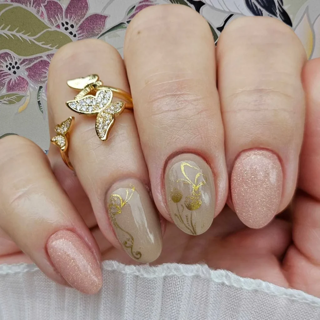 Soft beige and nude tones are accented with fine gold detailing and delicate shimmer. Subtle floral patterns in metallic gold add a touch of elegance while keeping the design minimal. The mix of matte shimmer and glossy finish provides dimension and variety.