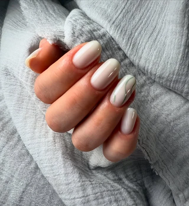 #19. White Oval Nails with Green Minimalist Art