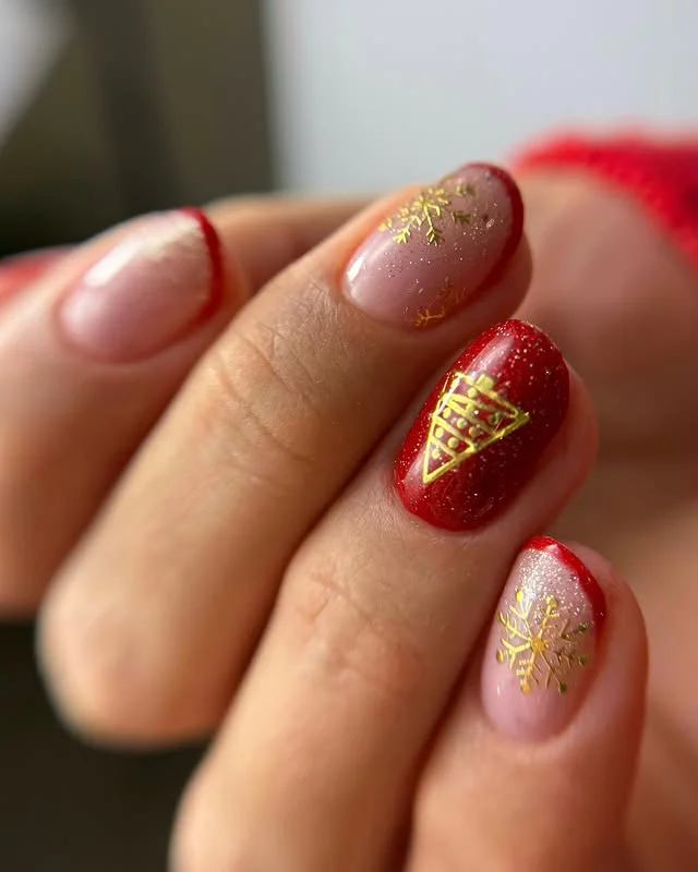 Shimmering red polish mixed with soft pink bases creates a joyful yet sophisticated holiday design. Golden snowflakes and a geometric Christmas tree detail add a celebratory sparkle that feels cheerful but polished. The combination of glitter and metallic accents elevates the entire look, making it stand out under festive lights.